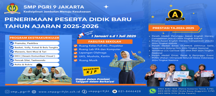 HITVBERITA.COM | SMP PGRI 9 Jakarta, merupakan salah satu sekolah swasta, yang bernaung dibawah Yayasan Pembina Lembaga Pendidikan (YPLP) Persatuan Guru Republi